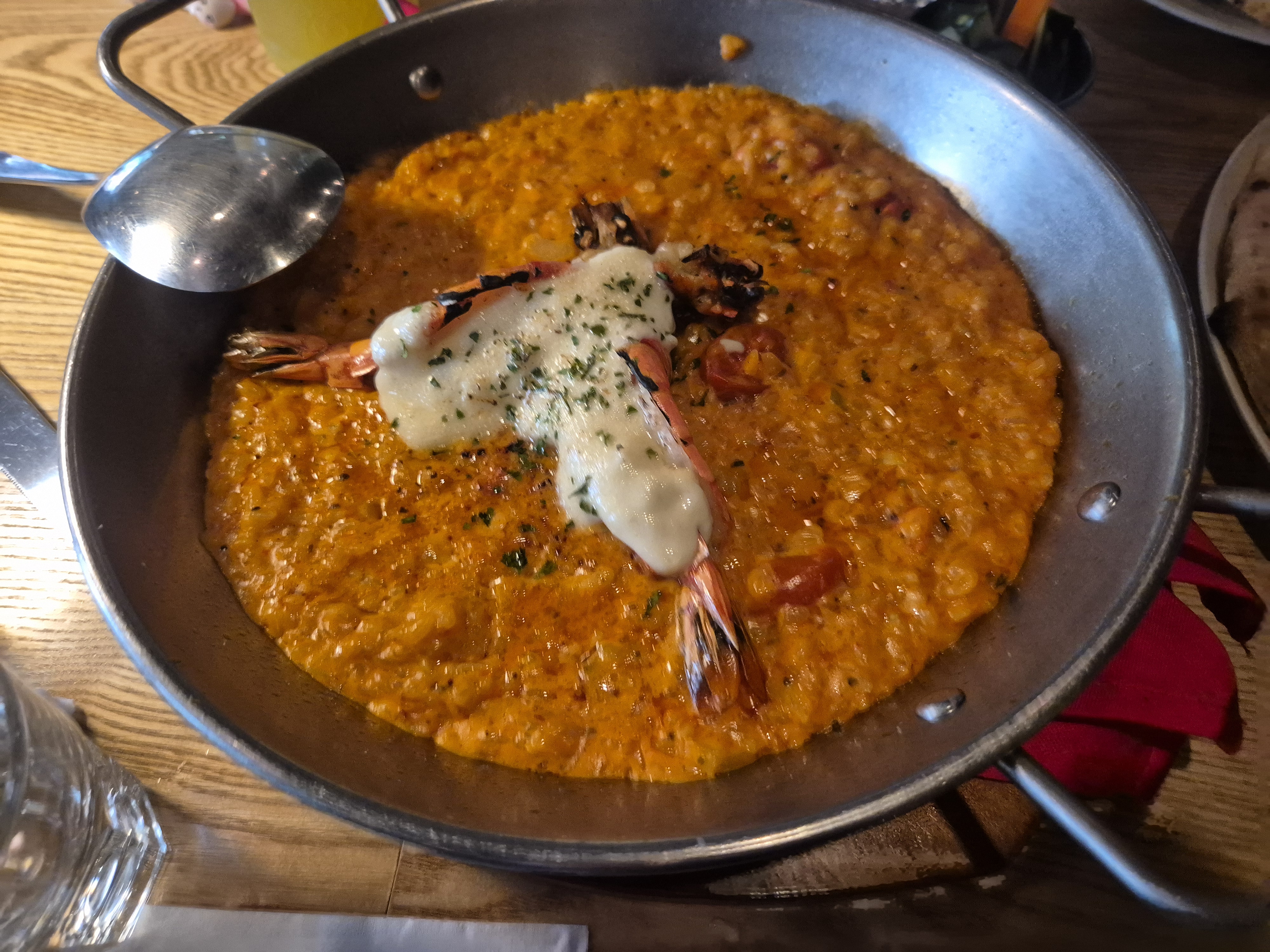 찾아보니 피자보다 빠에야가 맛있다고 하여 감바스로제빠에야 (32,500원)를 주문해 봤다. 이것도 맵기가 2 레벨로 되어 있는데 사실 그렇게 맵지는 않았다. 간이 조금 자극적이긴 한데 맛은 있더라. 새우 위에 올라가 있는 크림은 마요네즈 베이스인 거 같던데 ㅎㅎ 살짝 짠맛을 중화해 주는 단맛이 있긴 하더라.