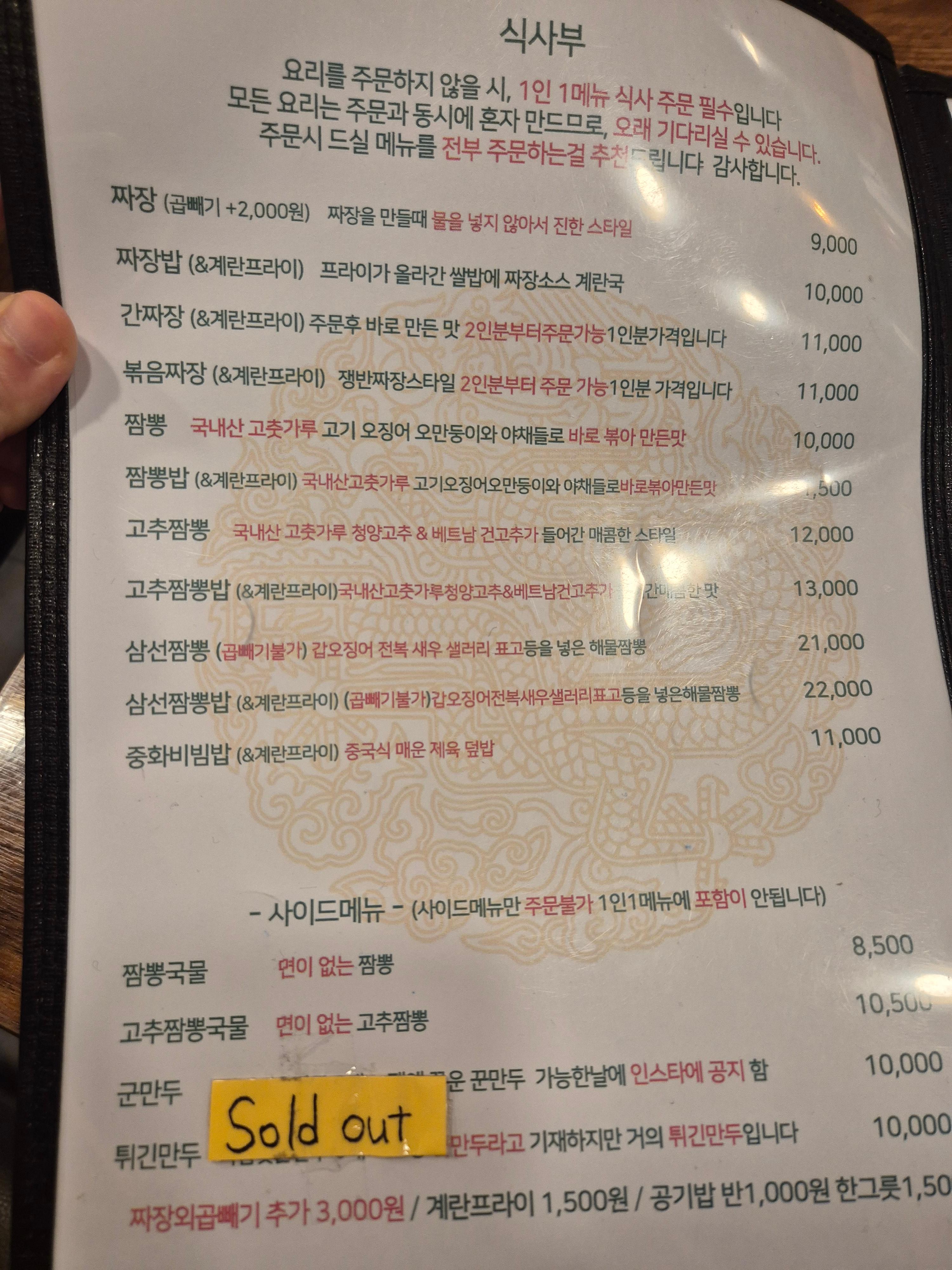 가격대는 조금 높은 편이다. 간짜장을 먹고 싶었는데 곤이 짬뽕을 먹고 싶다고 해 나는 그냥 짜장을 주문하기로 했다. 사실 면보다 밥이 좋기는 한데 여기 면이 특이하다고 하여 짜장으로 주문했다.