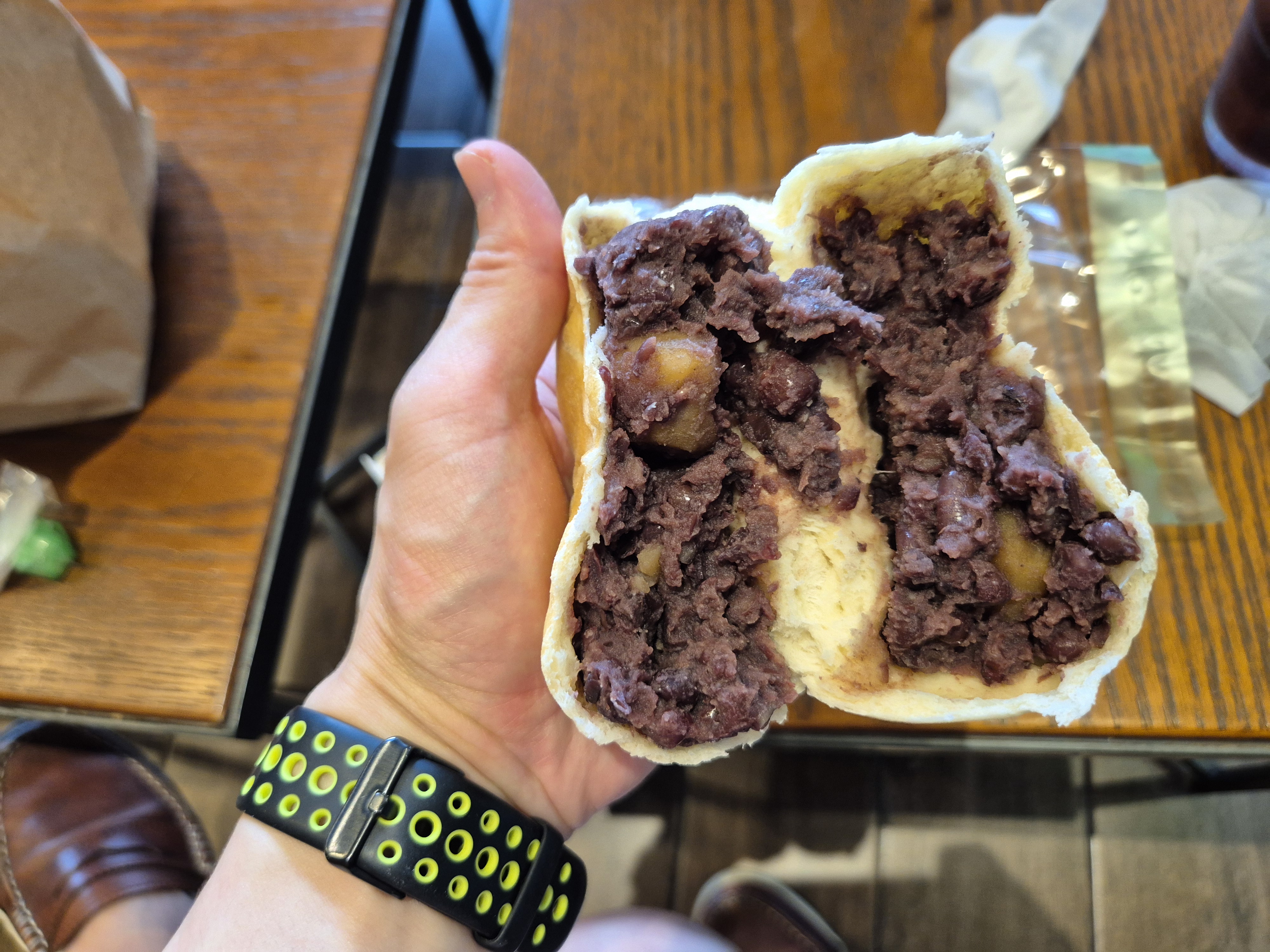 팥과 밤이 진짜 가득 들어있다. 팥소가 저렇게 많음에도 하나도 달지 않다. 오히려 담백해서 엄마는 완전 극호..ㅋㅋ 나는 살짝 아쉬운 느낌? ㅋㅋㅋ 근데 또 묘하게 매력적이긴 하더라. 반 정도는 남겨두고 저녁에 간식으로 먹었다.