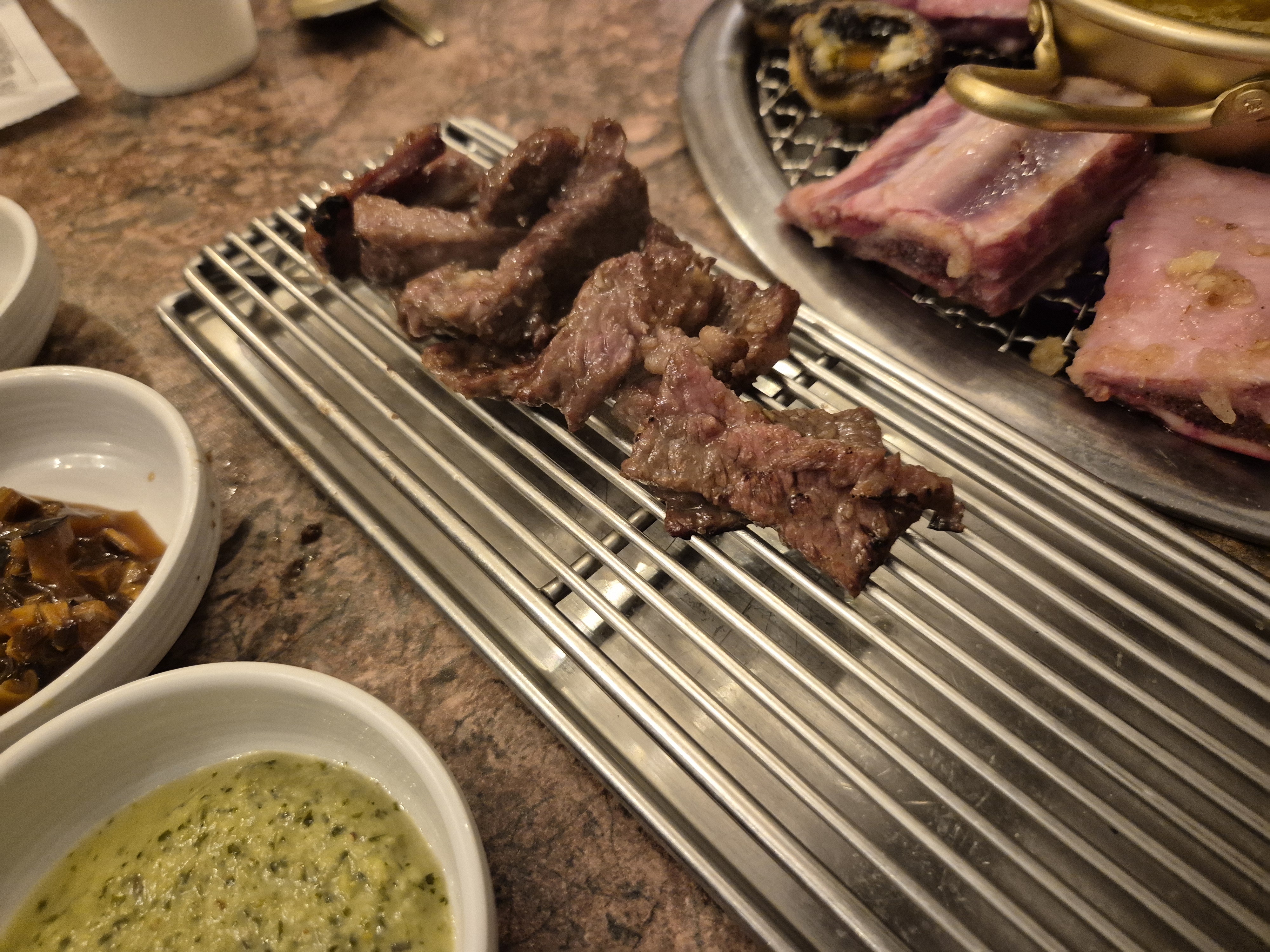 동생들이 열심히 구워 준 양념갈비!! 아주 단맛도 강하고 감칠맛도 세더라. 맛은 있는데 살짝 물리는 느낌!!
