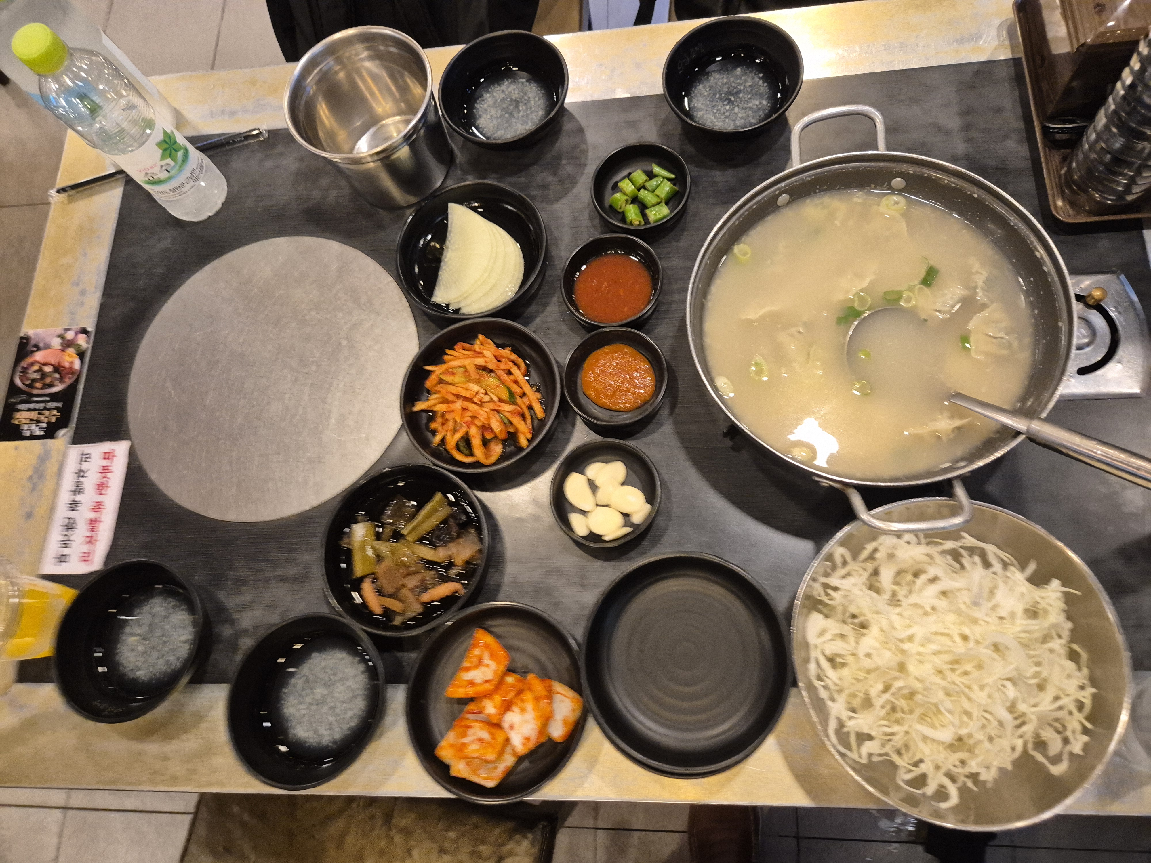 이야 정말 거의 한 5년 만에 와서 그런지 태블릿 메뉴판에다가.. 뭐가 많이 바뀌었더라. 원래 보쌈을 팔았었나. 기억이 아리까리하다. 여하튼 족발집에 와서 보쌈을 먹기는 아쉬워서 당연히 족발 메뉴 중에 골라봤다. 어라 그런데 여기 불족이 생겼네. 그래서 불족이 포함된 반반족발 대 세트를 주문했다. 만족 오향족발의 아이콘인 만둣국과 기본 반찬들이 착착 세팅되었다!