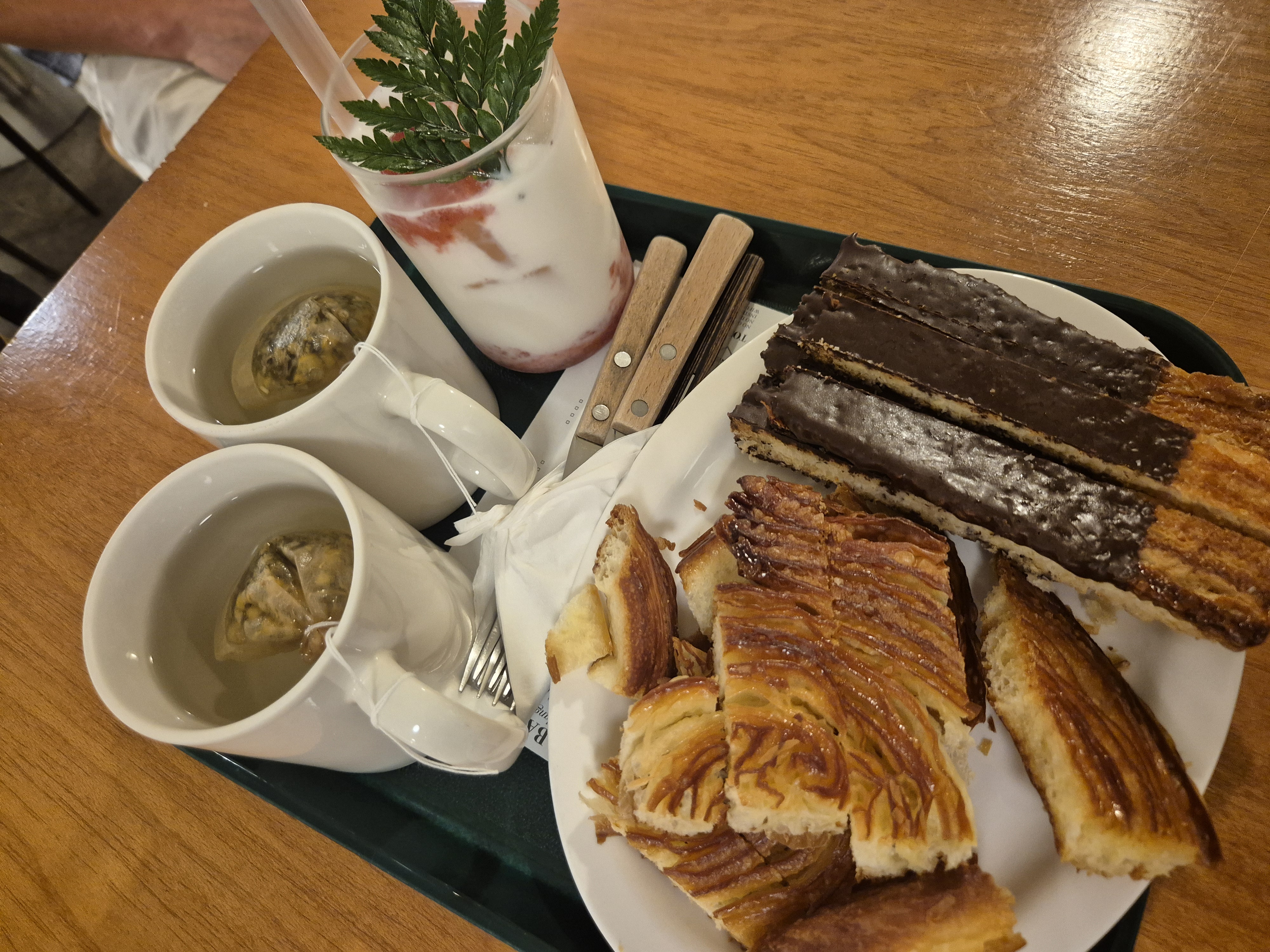 먹고 간다고 하니 이렇게 잘 잘라주셨네. 1인 1 음료라고 하여..ㅠㅠㅠ 딸기라떼(6,000원), 카모마일 티(6,000원) 2잔을 주문하였다. 퀴니아망은 매우 바삭바삭하고 버터맛이 듬뿍 느껴지는게 묘한 매력이 있었다. 빨미카레는 그냥 빵 부분도 고소하고 달달했는데 초코의 진한 풍미가 장난아니더라. 역시 전포는.. 빵집들이 다 괜찮은거 같다. 1인 1음료 의무 주문은 좀 아쉽지만.