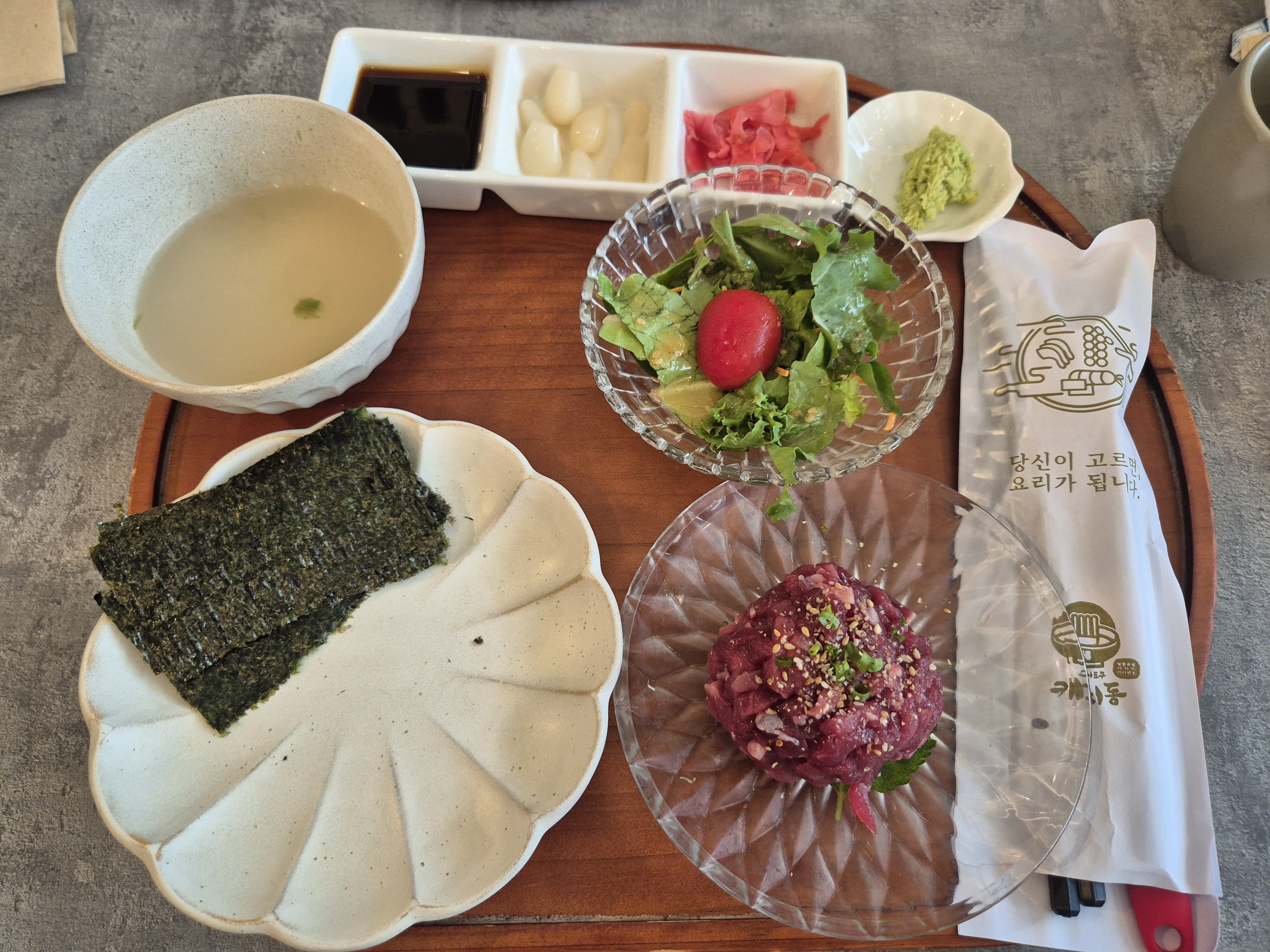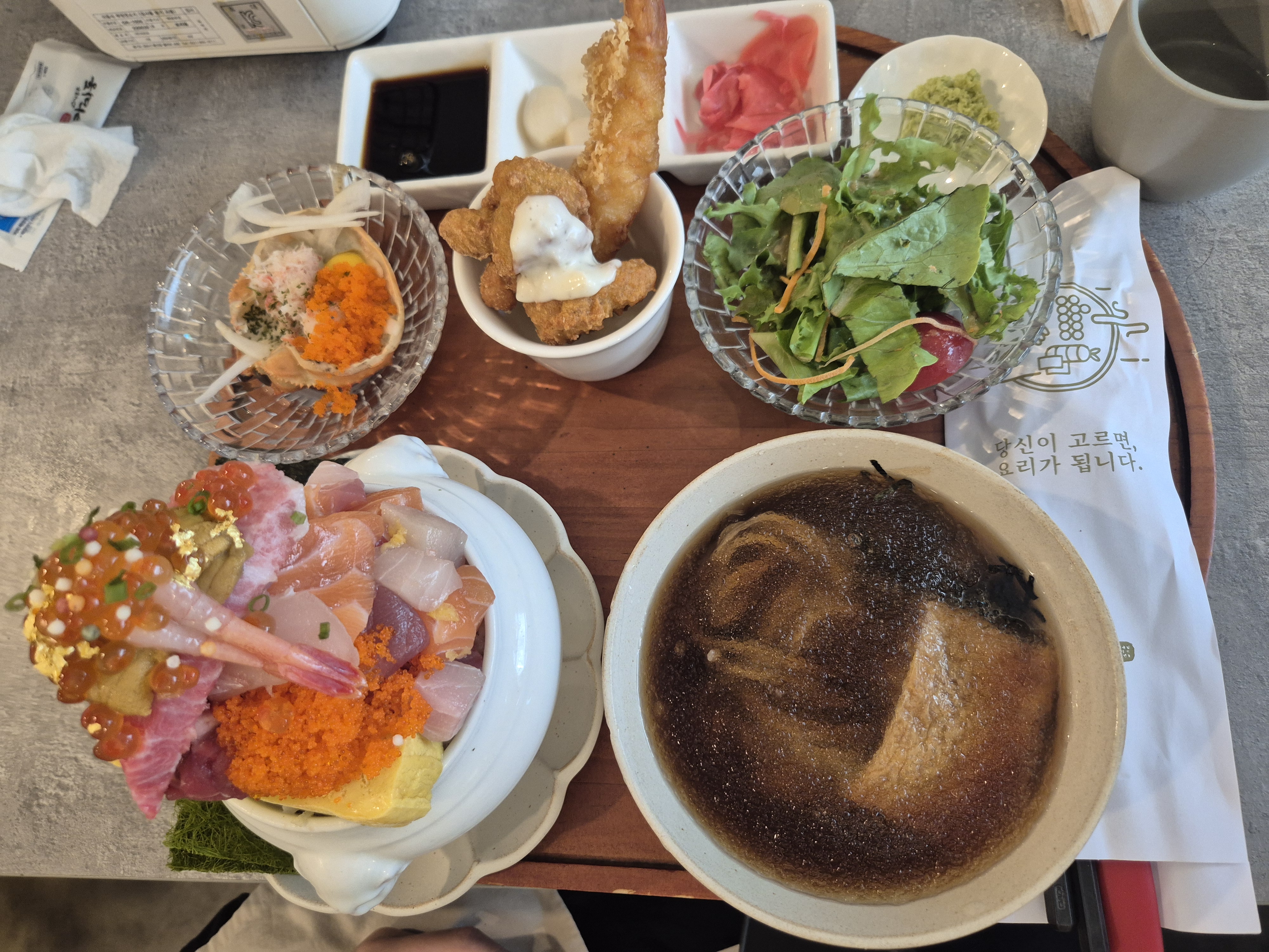 나는 다 먹을 자신이 없어서 같이 나눠 먹을 카미동 사시미(51,900원)을 주문해 봤다. 어라.. 그런데 사시미에도 이렇게 육회랑 육수가..ㅎㅎㅎㅎ 샐러드 맛이 상큼하고 괜찮더라. 육회는 신선하긴 한데 뭔가 간이 좀 약해서 흠... 그냥 쏘쏘..ㅎㅎ