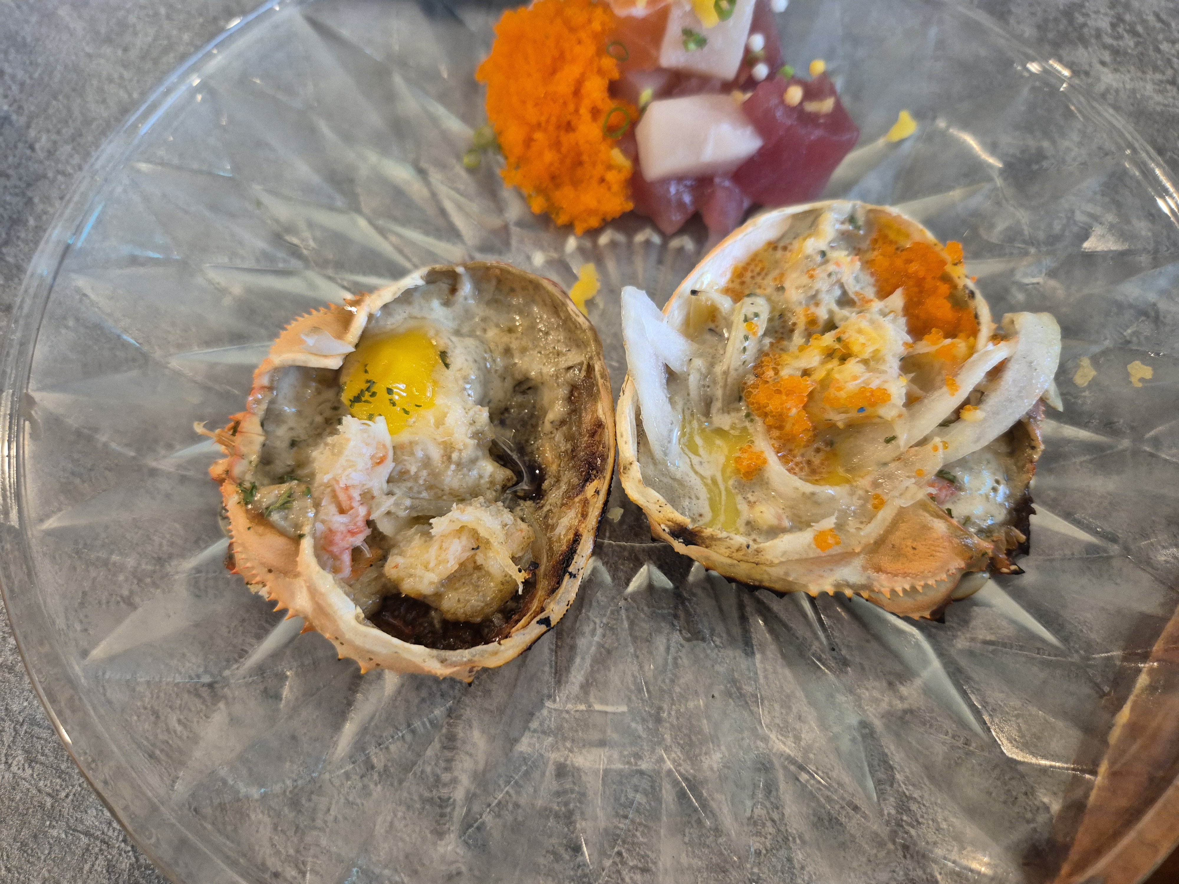 가격표를 찍지 않아서.. 정확하진 않다. 여하튼 절품지라시카미동(39,900원?)!! 으아 엄청 풍성하다. 다들 이 가격에 나올 수 없는 구성이라고.. 아마 같이 하는 오마카세나 스시집에서 남은 부위를 가져다가 쓸 수 있어서 이런 구성이 나오는 게 아닌가라고 추측하더라. 저 게딱지는 뽑기로 받은 녀석이다.. 곤과 나 모두 카카오톡 친구로 아직도 되어 있어서 무사히 경품추첨을 할 수 있었다. 같이 간 박사님도 같은 메뉴를 주문하셔서 생략..! ㅋ