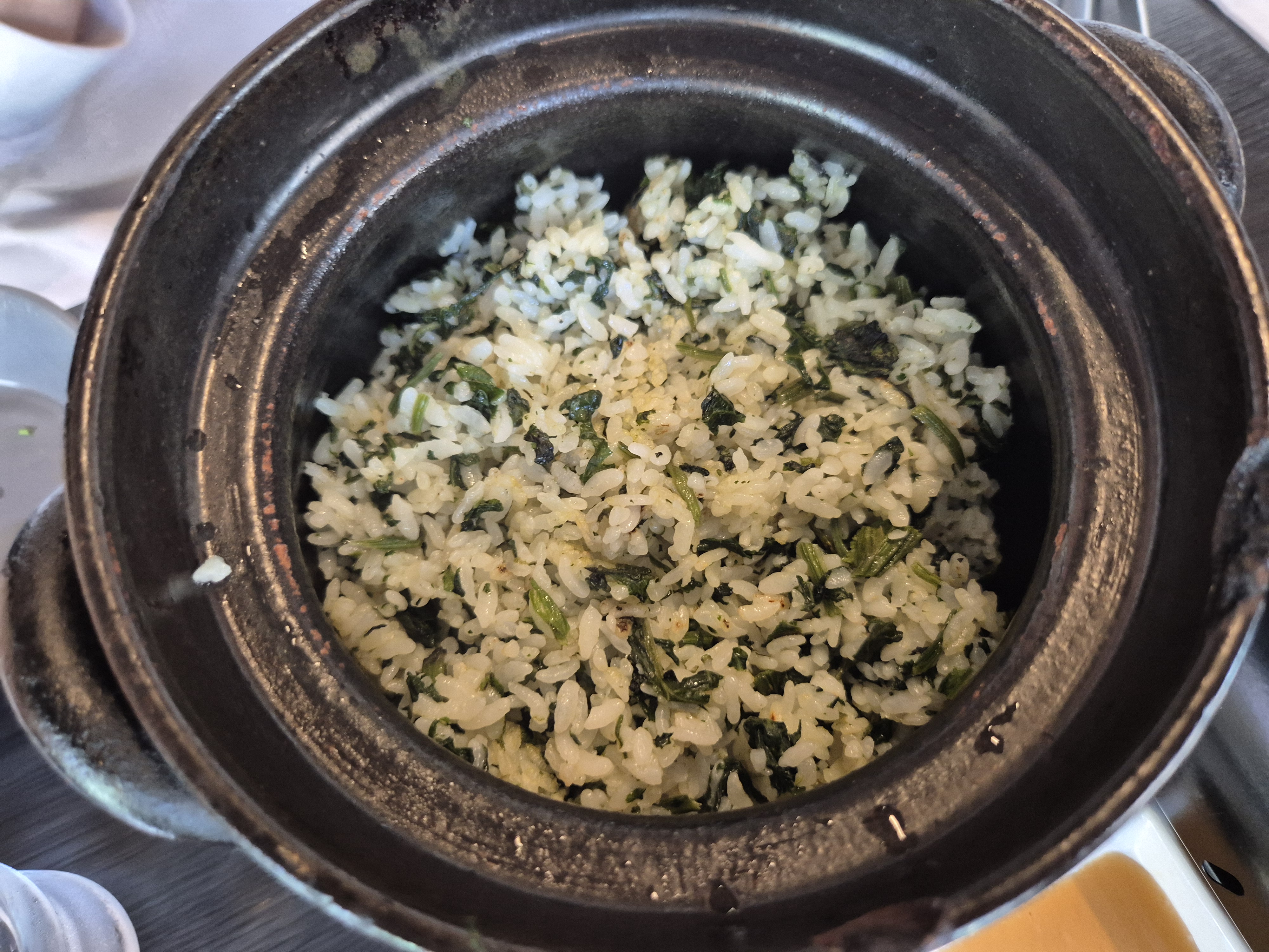 2인 테이블은 시그니처 솥밥 (69,000원) 세트로 주문하셨고 그렇게 해서 고등어솥밥을 조금 받아봤다. 살짝 고등어 냄새가 나긴 했는데 오잉 이거 은근히 묘하게 맛있더라. 맛잘알 박사님이 고추냉이랑 함께 먹으면 더 맛있을 거라고 해서 함께 먹으니 딱 그 생선 특유의 비릿한 맛도 좀 잡혀서 더 먹기 좋더라!!! 아 뭐랄까.. 맛이 없지는 않은데 그 냄새는 싫고.. 복잡한 기분이었다. 과연 다음에 오면 나는 어떤 솥밥을 시키고 싶을까.. ㅋㅋ