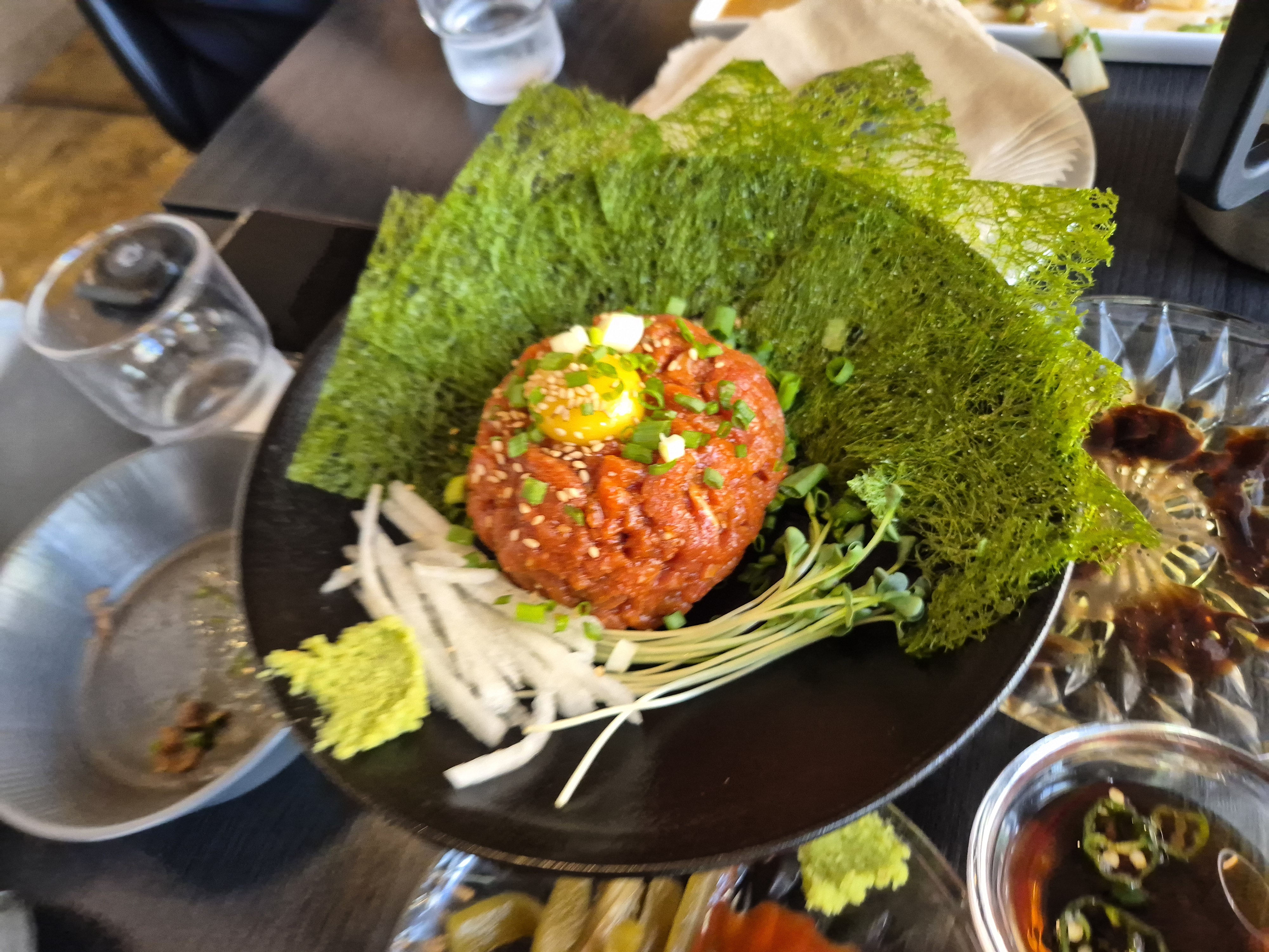 감태에 육회를 잘 싸서 고추냉이와 함께 먹으니 괜찮더라! 아니 근데 경상도도 아니고 빨간 양념 육회라니..ㅎㅎ