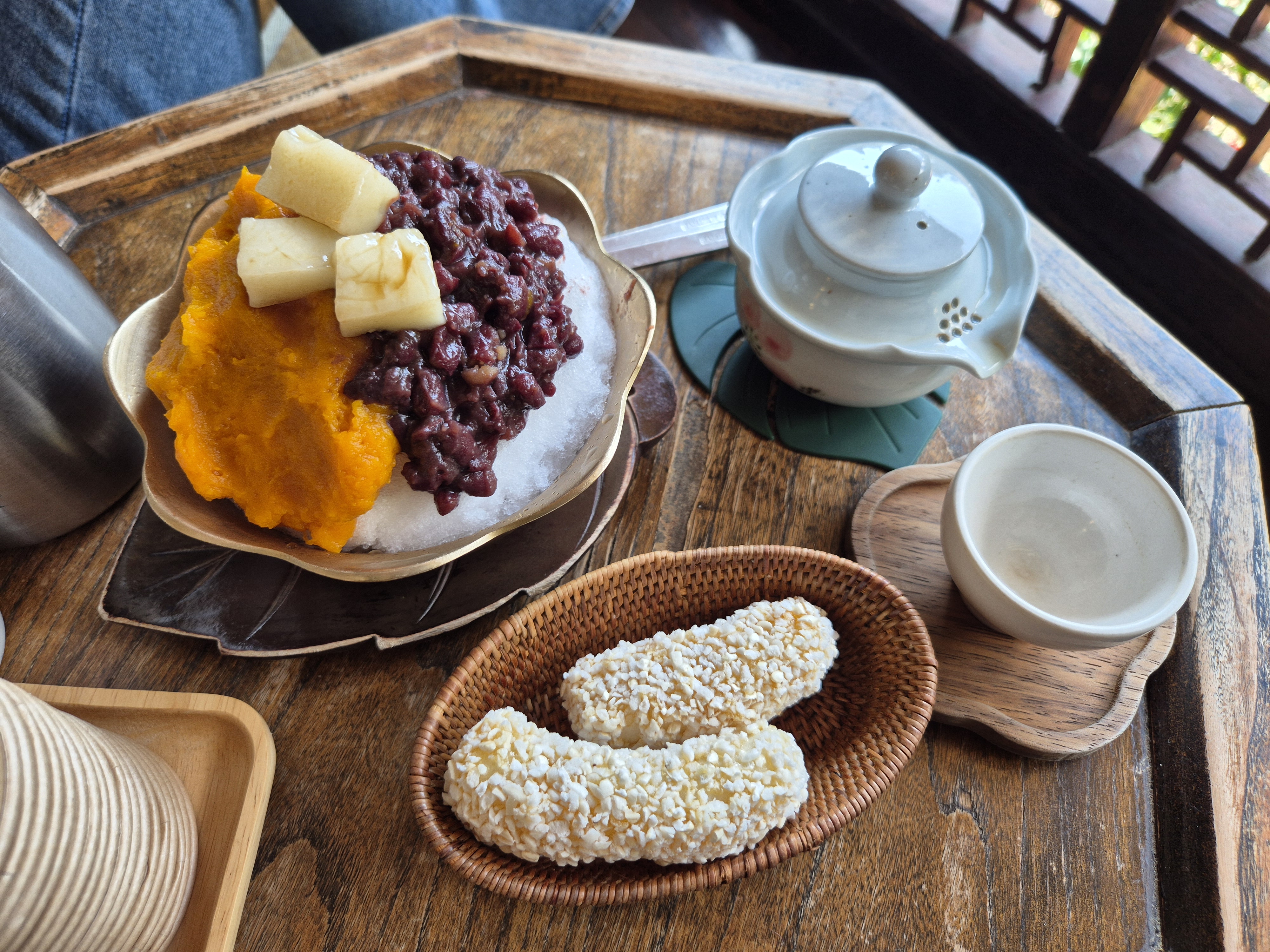 단호박 범벅이나 팥죽을 먹고 싶었는데 아직은 시즌이 아니라 주문은 안되나 보다.. 그래서 빙수를 주문했는데.. 아니...!! 홀로 온 외국인이 우리 뒷자리에 앉았는데 단호박 범벅을 먹고 있는 게 아닌가..!!! 아 너무 궁금했지만 물어보진 않았다.