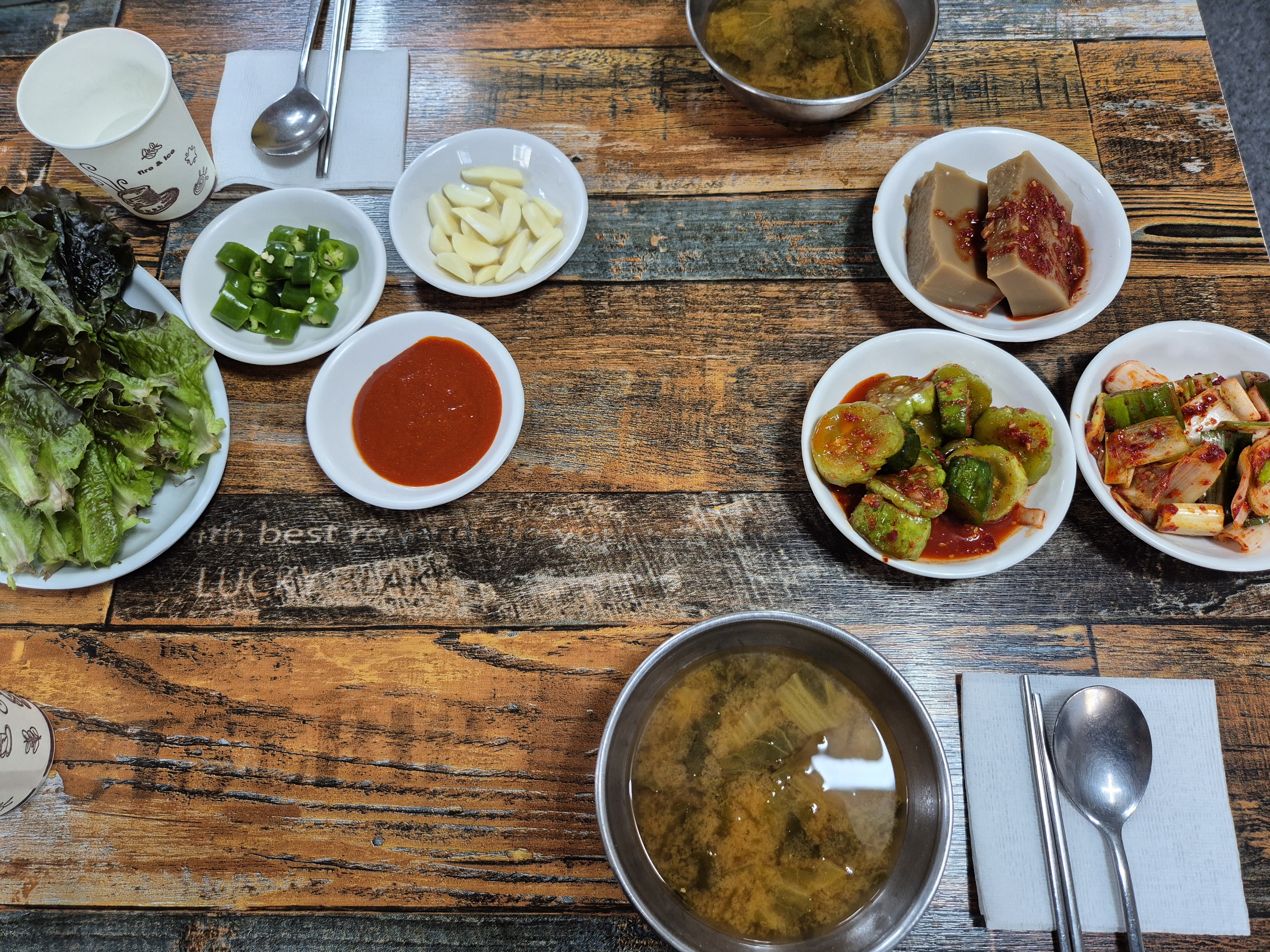 기본 반찬..! 오잉 생각보다 기본 반찬들이 다 좋더라. 저 오이무침이랑 파무침..! 양념도 적절한데 맛도 좋았따. 파무침은 매운맛이 싹 빠져서 너무 맛있더라. 도토리묵도 괜찮았고 말이다. 특이하게 쌈장대신 초장을 주셔서 좀 인상적이었다. 그런데 쌈에는 초장보다는 쌈장인 것 같다..ㅎ