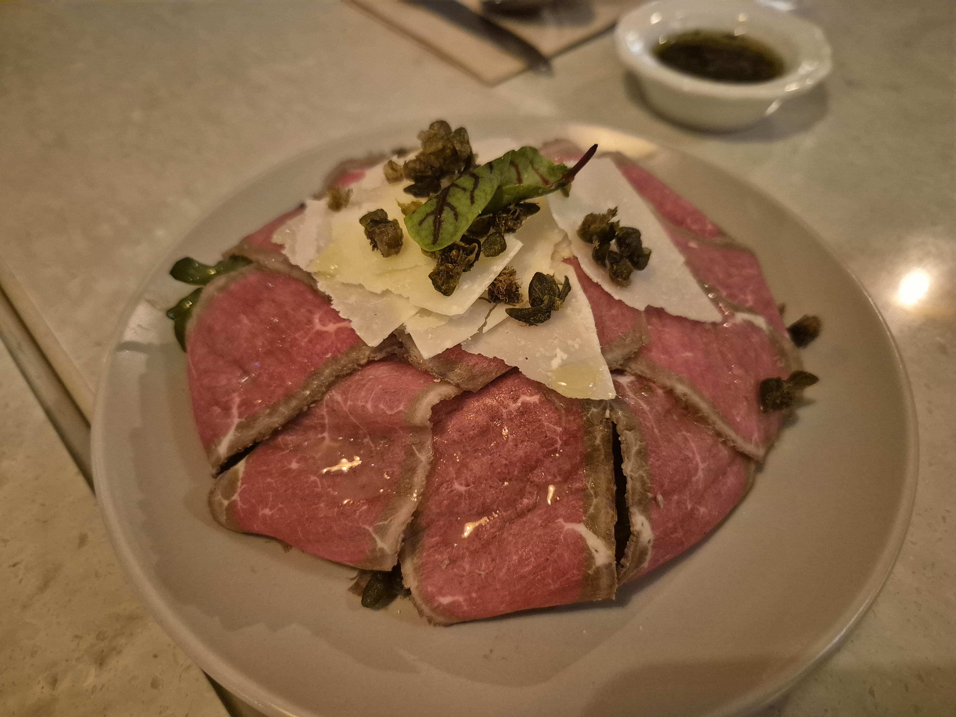 조금 늦게 오는 선배가 있어서 우리는 전체 2개를 시켜서 와인과 함께 나눠 먹으며 기다리기로 했다. 먼저 나온 홍두깨 까르파치오(18,000원)!